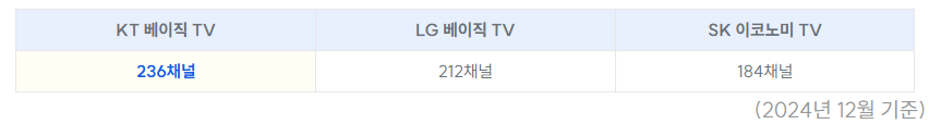 KT: 236채널 → 가장 많은 채널 수 제공