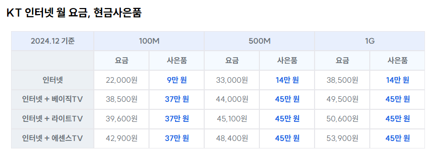 KT 인터넷 월 요금 & 사은품 (2024.12 기준)