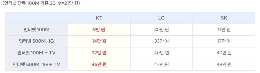 | 현금 사은품 | KT 기준 최대 48만원 | 인터넷+TV 결합 시 최대 47만원 |